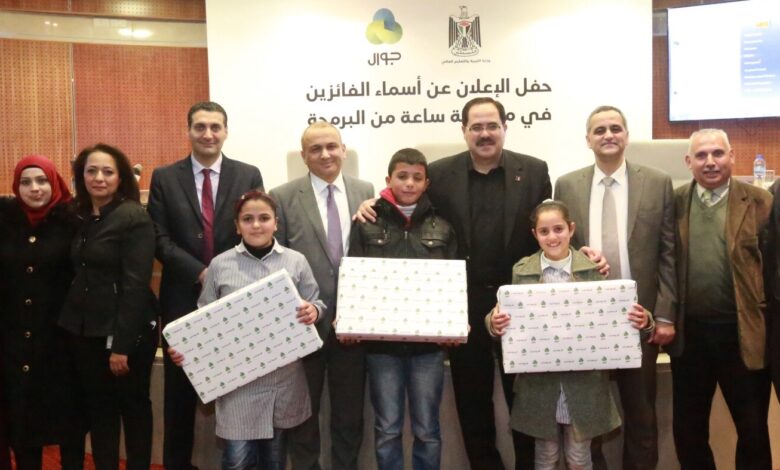 أعلنت شركة جوال عن أسماء الطلبة الفائزين بمسابقة " ساعة من البرمجة، والتي تنفذها للسنة الثالثة على التوالي وبالشراكة مع وزارة التربية والتعليم العالي، وبتنفيذ من مؤسسة مجموعة الاتصالات للتنمية المجتمعية الذراع التنموي لمجموعة الاتصالات الفلسطينية بشركاتها ( جوال ، شركة الاتصالات، حضارة، ريتش ، بالميديا)، وذلك خلال مراسم حفل الاعلان عن اسماء الطلاب الفائزين في المسابقة،والذي عُقد في شركة جوال برام الله، وبحضور وزير التربية والتعليم العالي د. صبري صيدم، ووزير الاتصالات وتكنولوجيا المعلومات د. علام موسى والرئيس التنفيذي لمجموعة الاتصالات الفلسطينية عمار العكر، ومدراء من وزارة التربية والتعليم العالي ووزارة الاتصالات وتكنولوجيا المعلومات ومجموعة الاتصالات الفلسطينية .