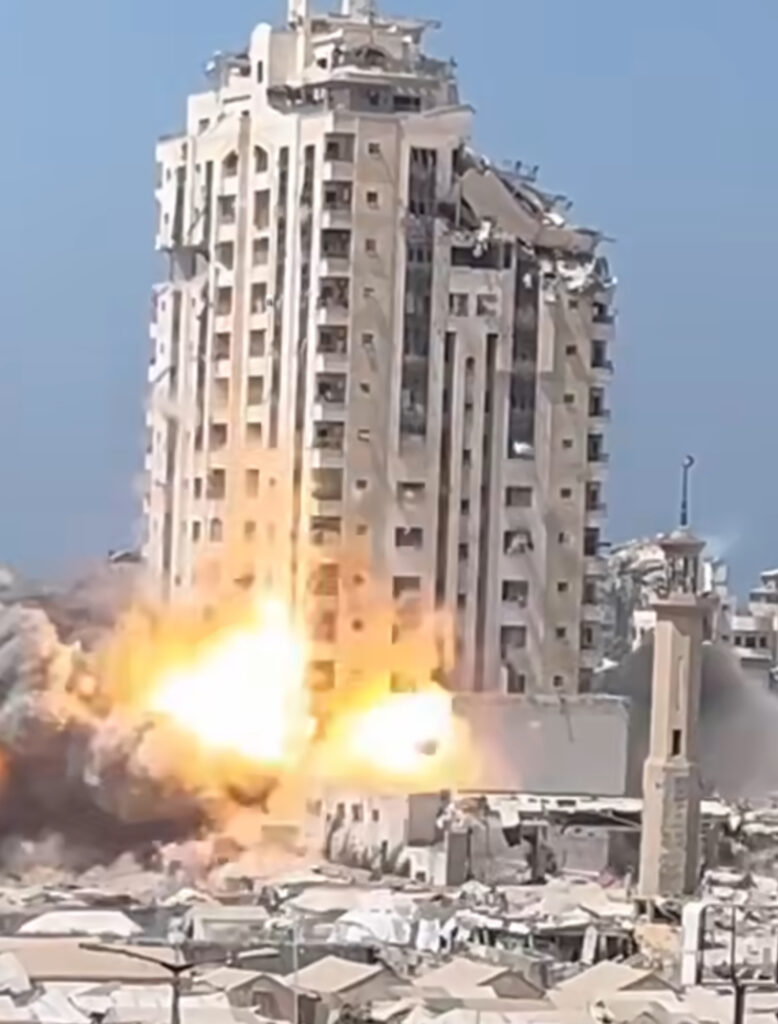 وقصفت طائرات الاحتلال البرج السكني الذي كان قد تعرض سابقا للقصف، بثلاثة صواريخ ما تسبب بتدميره بالكامل.