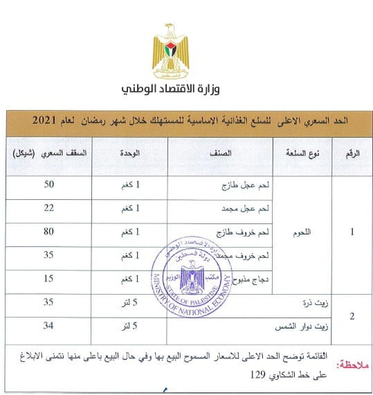 وحثت الوزارة التجار على مراعاة ظروف أبناء شعبنا في شهر رمضان، وعدم المغالاة تحت طائلة المساءلة القانونية، داعية في الوقت ذاته المواطنين إلى التقدم بأي شكوى عبر الرقم 129.