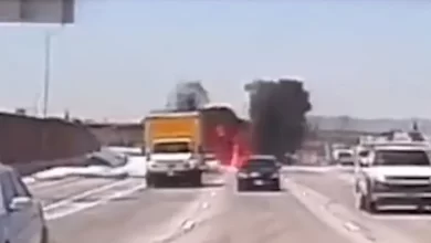 مشهد لا يُصدق.. طائرة تسقط وتشتعل وسط الطريق السريع وقائدها ينجو من النيران