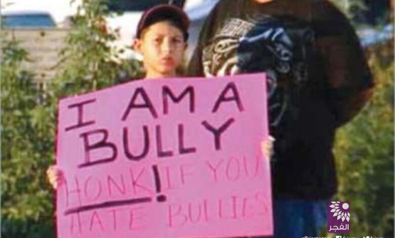 تلفزيون الفجر الجديد- أراد أب أمريكي صارم أن يلقن ابنه درساً قاسياً عقاباً له على ممارسته البلطجة ضد زملائه في المدرسة فأرغمه على الوقوف على تقاطع طرق رئيسي رافعاً لافتة كبيرة كتب عليها: "أنا بلطجي. أطلق بوق سيارتك إذا كنت تكره البلطجية".