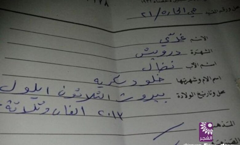 تلفزيون الفجر الجديد– نشر نضال درويش وخلود سكرية صورة عن إخراج قيد طفلهما غدي عبر موقع فايسبوك، وبدت خانة القيد الطائفي مشطوبة.