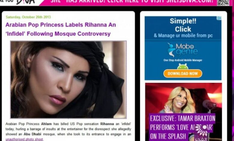 وصفت أميرة البوب العربي أحلام , مغنية البوب الأمريكية " ريهانا" بالكافرة وألقت عليها وابل من الشتائم بحجة عدم احترامها لمسجد أبو ظبي , عندما استخدمت المدخل لالتقاط الصور .