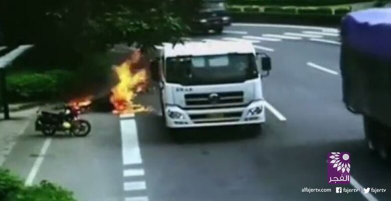 والتقطت كاميرا المراقبة في أحد شوارع مدينة فوشان، جنوبي الصين، اللحظة الدرامية للحادث واشتعال النار في الدراجة النارية والمرأة التي كانت تقودها.