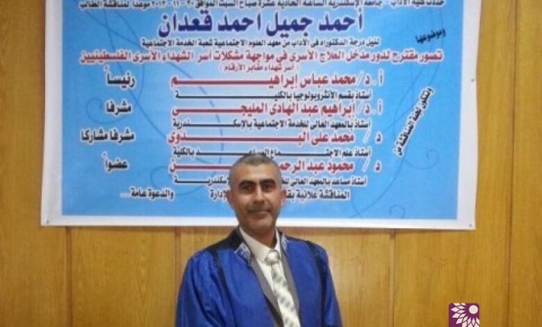 تلفزيون الفجر الجديد – حصل الباحث الفلسطيني أحمد جميل أحمد قعدان على درجة الدكتوراه بامتياز مع مرتبة الشرف الأولى في بحثه المتعلق بأسر شهداء مقابر الأرقام، وذلك من كلية الآداب بجامعة الإسكندرية في مصر.