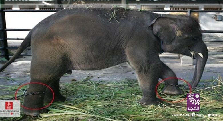 وعرضت الصحيفة البريطانية، صورا تدل على الإهمال الذي تواجهه حديقة "سورابايا" بإندونيسيا، فيظهر الفيل الذي يبدو وزنه أقل بكثير من المعتاد، مكبلاً بسلاسل حديدية غليظة لا تسمح له بالتحرك يمينًا أو يسارًا، وتفسر الحديقة ذلك بأنها تريد الأموال التي يدفعها الأطفال ثمنًا لإطعامه أو لمسه واللعب معه؛ وتسبب له تلك السلاسل الكثير من التقرحات والجروح أسفل قدمه، والتي لا يتم فك قيده منها إلا في نهاية كل يوم.