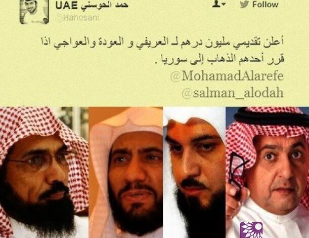 تلفزيون الفجر الجديد– أعلن الناشط الإماراتي حمد الحوسني عبر حسابه في تويتر عن استعداده لدفع مليون درهم للدعاة السعوديين محمد العريفي وسلمان العودة ومحسن العواجي إن قرر أحدهم الذهاب إلى سوريا.