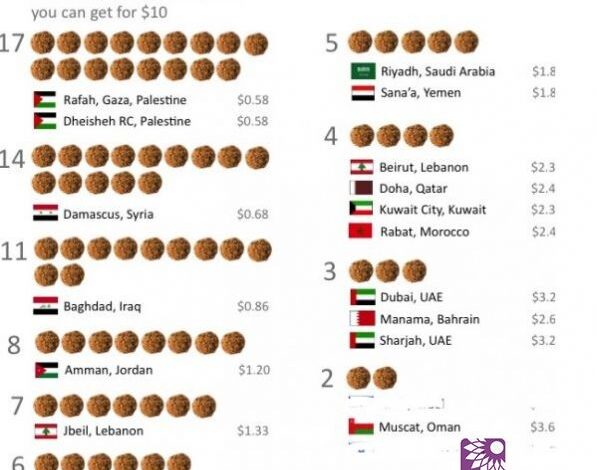 من جهة أخرى، يبلغ سعر سندويش الفلافل في غزّة 0.58$ أي أنّ الفلسطينيين بإمكانهم شراء 17 سندويشاً بقيمة 10$: وهو أرخص سعر في الشرق الاوسط. تلي فلسطين، سوريا بنسبة 0.68 للسندويش.