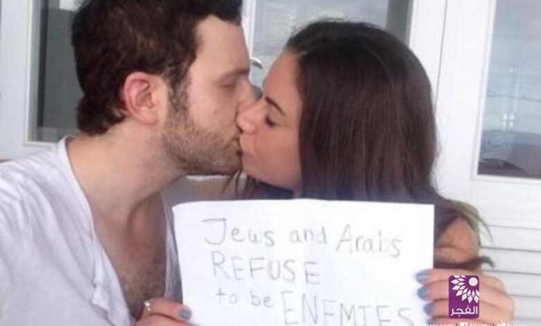 تلفزيون الفجر الجديد- نشرت صحفية من أصل لبناني تدعى سولومى أندريسون صورة لها بحسابها على موقع التواصل الاجتماعى تويتر، وهي تعطي قبلة رومانسية لصديقها اليهودى، وتمسك ورقة مكتوب بها “اليهود والعرب يرفضون أن يكونوا أعداء”.