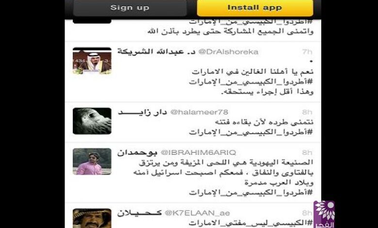 وتداول المغردون على موقع التواصل الاجتماعي "تويتر" هاشتاقاً تابعته "إيلاف" حمل عنوان #أطردوا_الكبيسي_ من_الإمارات. ووجد هذا الهاشتاق تفاعلاً كبيرًا من قبل المغردين الإماراتيين والخليجيين.