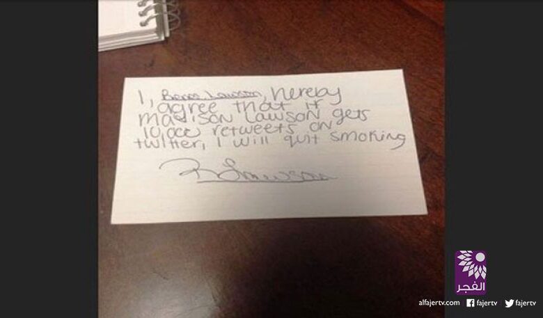 ومؤخرا وجدت فتاتان ماديسون لوسون وشقيقتها طريقة عبقرية لإقناع والدتهم بالتوقف عن التدخين، عن طريق موقع تويتر للتغريدات القصيرة، وعقدوا رهان مع والدتهم رينيه لوسون التى تدخن منذ 22 عاما بأن إذا وصل عدد "الريتويت" للتغريدة الخاصة بهم إلى 10 آلاف ريتويت ستقلع عن التدخين وإذا لم تصل سيكفون عن طلب ذلك منها.