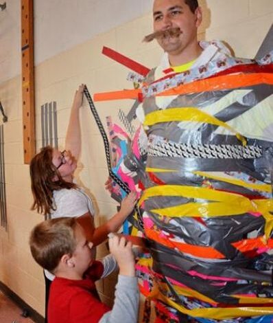 وأستخدام الطلاب عشرات الأمتار من الأشرطة اللاصقة، وبقي معلقا من الصباح وحتى وقت الغداء يوم الجمعة الماضي تنفيذا لوعده.
