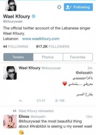 تلفزيون الفجر الجديد- غرّدت النجمة إليسا لصديقها المقرّب وائل كفوري، أن أجمل ما في حلولها ضيفة على برنامج اراب آيدول هو رؤيته، فما كان من وائل إلا أن رد على إليسا بتغريدة قال فيها: يا غراميييييي بعروقي بتمشي بفارغ الصبر بعد كل هذا الحب من الكفوري لم تجد إليسا سوى القلوب كتغريدة لتعبّر عن حبها لصديق عمرها وائل. هذه الصداقة التي لم تتأثر يوماً بالشائعات وكل ما حيك حولها من أخبار عن غرام يجمع الطرفين وعن توتر العلاقة بعد دخول مايا دياب إلى حياة وائل.