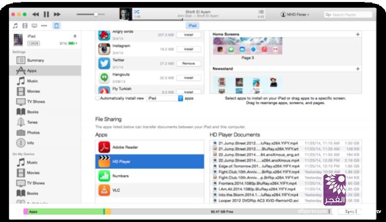 لنقل أي فيلم إلى الجهاز يمكن وصله بالحاسب وتشغيل برنامج آيتيونز. وبعد اختيار الجهاز داخله، يتم الانتقال إلى تبويب التطبيقات Apps. أخيراً، بالنزول إلى أسفل الصفحة تتوفر قائمة بعنوان مشاركة الملفات File Sharing يقوم المستخدم باختيار HD Player من القائمة ثم يقوم بنقل الأفلام إلى المساحة المخصصة ليتم نقلها مباشرةً إلى الجهاز.