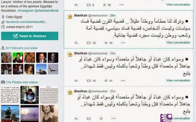 تلفزيون الفجر الجديد – علقت النجمة شيريهان على حكم براءة محمد حسنى مبارك ونجليه ووزير داخليته العادلى على حسابها الرسمى على تويتر: “بشهادة التوأمين الماء والهواء، بشهادة الجماد والحيوان والإنسان، بشهادة جميع الغازات المختلفة والعناصر وجميع الكائنات الحية، ما مررنا به وما عشناهُ وما نَعيشَهُ حتى يومنا هذا فى جمهورية مصر العربية من “كوارث إنسانية” تعليمية وصحية وزراعية وصناعية واجتماعية واقتصادية جريمة فى حق مصر “وطن ومواطن” جميعها نتاج فساد سياسات عصر بأكمله محمد حسنى مبارك”.