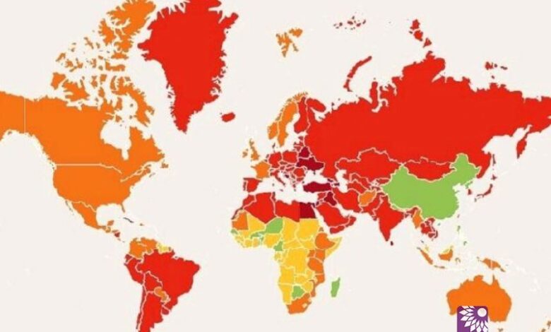 وفي الدول الأجنبية، نرى على الخريطة إيران (8.28) وإسرائيل (7.29) والولايات المتحدة (10.17) وكندا (9.52) والبرازيل (7.56) وفرنسا (9.22) وبريطانيا (9.28) وروسيا (7.46) والسويد (9.09) وجارتها النرويج (9.30) والهند (8.05) وأستراليا (9.59).