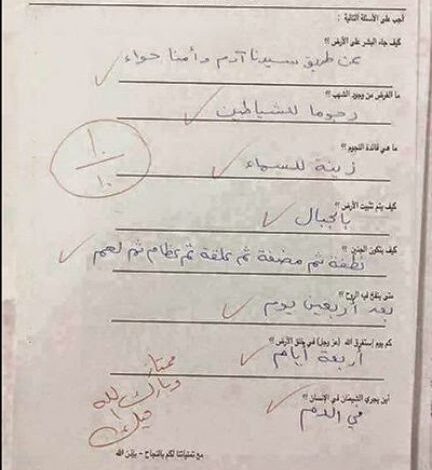 وكان هناك سؤال: "ما هي فائدة النجوم لتكون الإجابة زينة للسماء"، وسؤال "كيف يتم تثبيت الأرض، والإجابة بالجبال"، وسؤال "كم يوم استغرق الله – عز وجل – في خلق الأرض، والإجابة أربعة أيام، وختم الامتحان بسؤال أين يجري الشيطان في الإنسان والإجابة في الدم.