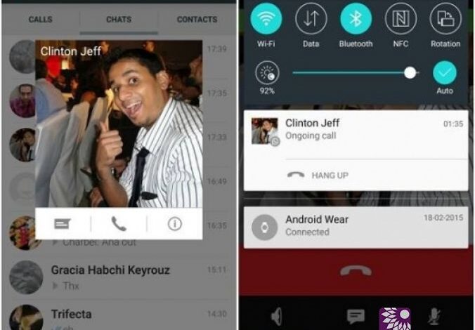 بالنسبة للمكالمات الصادرة في WhatsApp فتبقى ضمن التنبيهات حتى يقوم المستخدم بتعليقها أو إنهائها. عندما يقوم المستخدم بفتح محادثة نصية مع جهة اتصال معينة يظهر زر الاتصال في شريط الأحدات في حين أصبحت صور جهات الاتصال بدوائر أكبر مع خيارات لإرسال رسالة أو اتصال صوتي أو إظهار التفاصيل