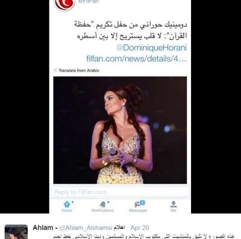 ومن خلال حسابها على تويتر، نشرت أحلام خبر قام أحد المواقع المصرية بنشره مرفق بصورة جريئة لدومينيك، وعلَّقت أحلام بالقول: هذه الصورة لا تليق بالمنشيت اللي مكتوب.. الاسلام والمسلمين ودينا الاسلامي خط احمر والقران الكريم بالدرجه الاولى؟”.