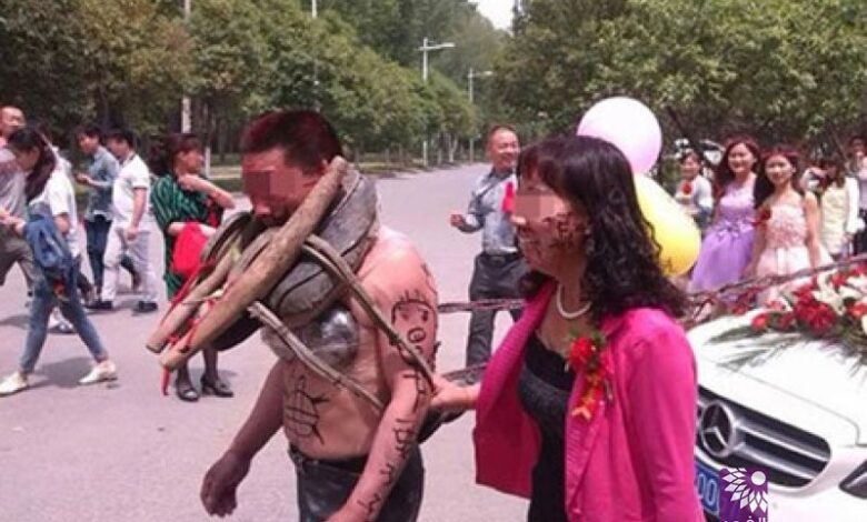 تداول مستخدمو الإنترنت الصينيون صورًا مثيرة للجدل يظهر فيها عريس يطوف الشوارع مع عروسه مربوطًا بطوق في عربة الزفاف بطريقة مهينة جدًا، بدلاً من أن يطوف الشوارع مع عروسه بكامل أناقته داخل سيارة زفاف مكشوفة.