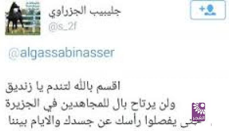 كما غرد نفس الحساب الذي هدد ناصر القصبي عبر هاشتاق أطلقه بعنوان مطلوب رأس ناصر القصبي للمجاهدين، حيث كتب تحته "تكفون يا مجاهدي الجزيرة نريد رأس هذا الخبيث، جزوا الرؤوس لنصرة الدين".