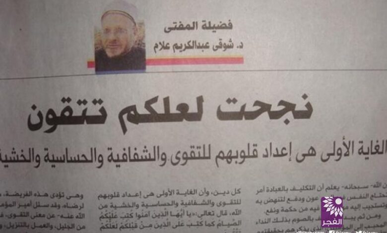 وكتب علام مقالا بجريدة "اليوم السابع" يوم أمس الثلاثاء، تحت عنوان: "نجحت لعلكم تتقون"، بدأه هكذا: "إن الله -سبحانه- يعلم أن التكليف بالعبادة أمر تحتاج النفس البشرية فيه إلى عون، ودفع لتنهض به وتستجيب إليه مهما يكن فيه من حكمة ونفع".