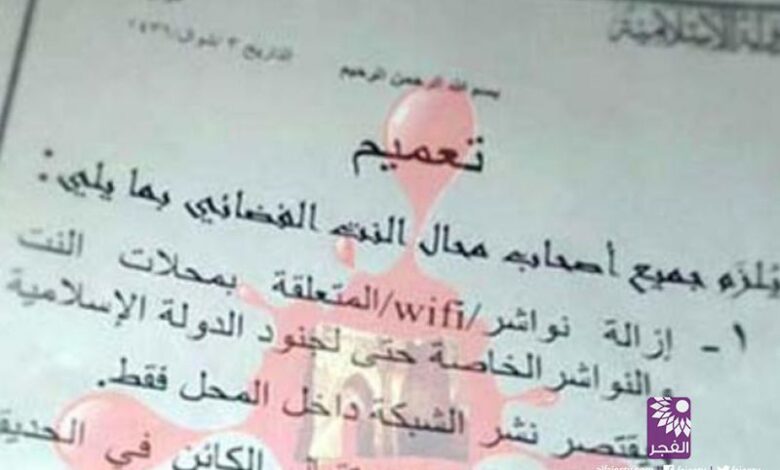 ويلزم التعميم- الذي قال ناشطو الحملة إن التنظيم قام بنشره في الرقة- أصحاب مقاهي الإنترنت الفضائي بإزالة أجهزة توزيع الإنترنت "النواشر"، بما في ذلك تلك الخاصة بمقاتلي التنظيم، والاكتفاء بتوفير خدمة الإنترنت داخل المحلات فقط.