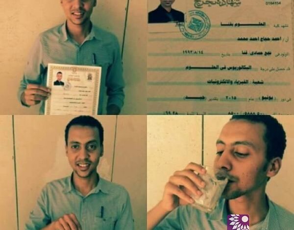 وبحسب الصور، فإن الشاب مصري الجنسية، ويدعى أحمد حجاج أحمد من محافظة قنا، صعيد مصر، وحاصل على بكالوريوس علوم عام 2015 بتقدير عام جيد.
