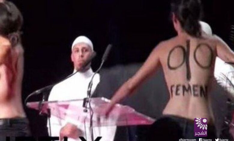 تلفزيون الفجر الجديد – اعتلت فتاتين عاريتي الصدر فجأة المنصة التي كان يلقي من خلالها شيخين مداخلة حول موضوع المرأة في الإسلام، وأخذتا تحتجان وتصرخان وعلى صدريهما عبارة: “لا احد يستعبدني” وعبارة “أنا نبي نفسي”.