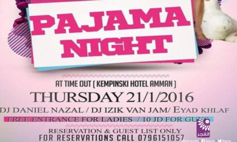 أثار إعلان نشرته إحدى الشركات المختصة بإقامة الاحتفالات عزمها إقامة حفل خاص باسم “يوم البيجاما” الخميس القادم، في احد فنادق العاصمة عمان سخطاً كبيراً بين عدد كبير من افراد المجتمع الأردني الذين اعتبروا الإعلان بحد ذاته مهيناً للعادات والتقاليد وخادشاً للحياء.