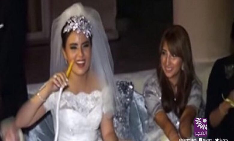 وظهرت العروسة وهي تجلس في إحدى الغرف الملحقة بقاعة فرحها وهي تدخن الشيشة باحترافية وتتحدث بسعادة بالغة إلى صديقاتها اللاتي يجلسن حولها.