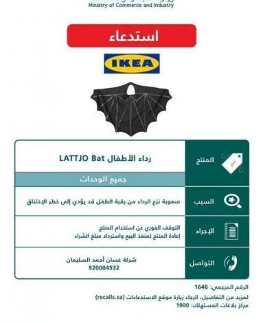 أعلنت وزارة التجارة والصناعة السعودية عن استدعائها لرداء الأطفال Lattjo Bat لصعوبة نزعه من رقبة الأطفال، ما قد يؤدي إلى الاختناق ومن ثم الموت.