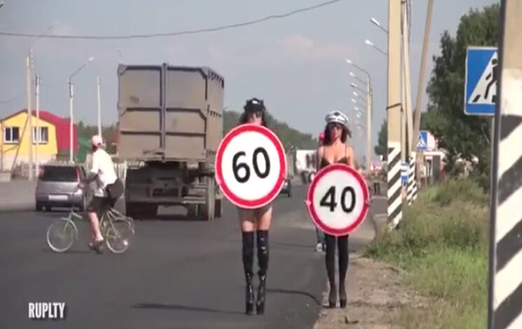 ظهرت شابتان روسيتان في فيديو نشر على موقع “يوتيوب”، شبه عاريتين، وهما ترفعان لوحتين تحددان السرعة القصوى بـ60 و40 كلم بالساعة، وذلك على طريق سريع قرب بلدة سيفرني في إقليم نيزني نوفغورود أوبلاست؛ لحث السائقين على تخفيف سرعتهم.