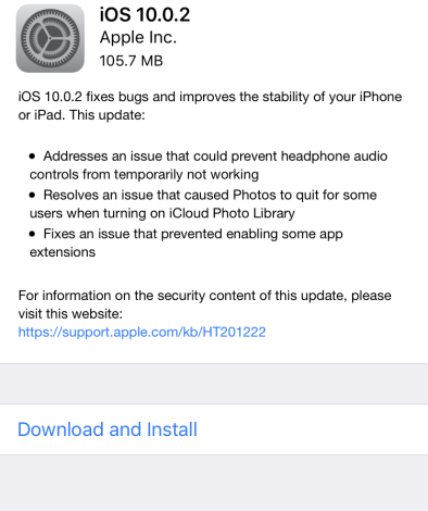 أطلقت آبل تحديث فرعي طارئ جديد وسريع لنظام iOS يحمل الرقم 10.0.2 لحل مشاكل ظهرت مؤخراً في التعامل مع سماعات الصوت عبر منفذ Lightning في الآيفون 7.