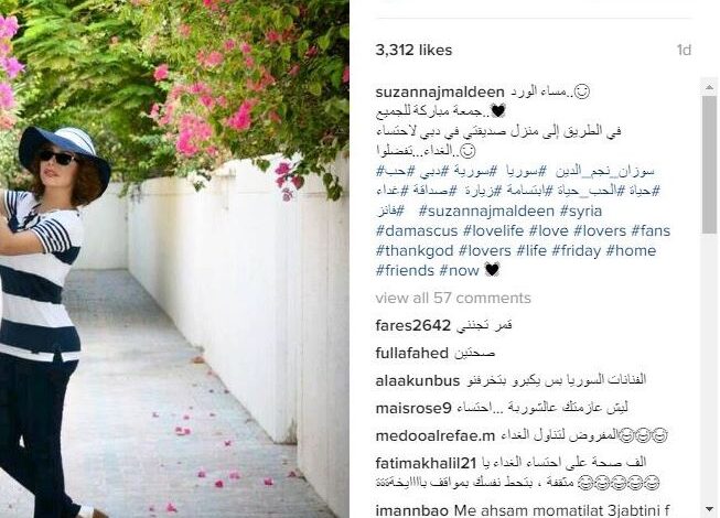 تعرضت الممثلة السورية سوزان نجم الدين لموجة من السخرية بعد نشرها صورة له معلقة عليها: “في الطريق إلى منزل صديقتي في دبي لاحتساء الغداء…تفضلوا".