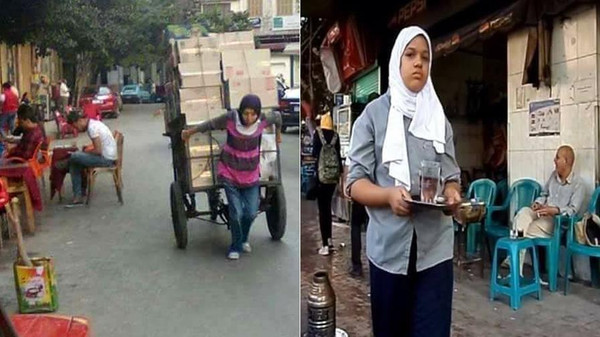 الفتاتان ومن المفارقات الغريبة أنهما تم التقاط الصورتين لهما بجوار مقهيين، الأولى لفتاة تعمل نادلة في المقهى وتقدم الطلبات لرواد المقهى من الشباب والرجال من أجل لقمة العيش، ولكي تساعد أسرتها في تدبير نفقات الحياة، والثانية لفتاة تجر شاحنة مكدسة بمواد غذائية لمحل يمتلكه والدها، ويبدو عليها آثار التعب والإرهاق لثقل الشاحنة وتمر بحوار مقهى يجلس عليه شباب متعطل منهمك في اللعب على هواتفه المحمولة.