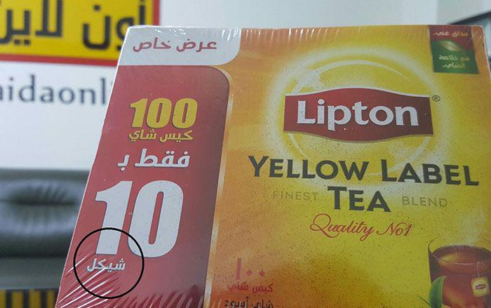 وقال مراسل الميادين إنّ أحد المواطنين تمكّن من نشر صورة تؤكد وجود منتج من شاي Lipton يباع في سوبرماركت كتب عليه " عرض خاص 100 كيس شاي فقط ب 10 شيكل".