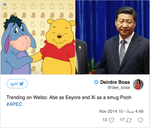 ليتم حذر استخدام أى صورة للدب "بووه" على منصات التواصل الاجتماعي الصينية، وحذف أي مشاركة تقارن بين الدب والرئيس الصيني، وتصبح الصورة الأكثر مراقبة على الإنترنت منذ عام 2015.