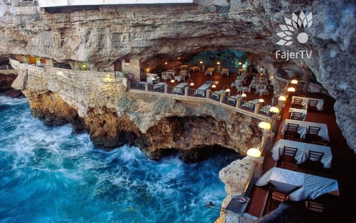 1- مطعم جروتا بلازيس في باري بإيطاليا. ما رأيك بأن تتناول طعامك في أحضان الطبيعة بين هذه الصخور العجيبة والمذهلة والتي تطل على هذا المظهر الساحر والبحر ذو الأمواج العاتية والمياة الصافية. تجربة ساحرة بكل المقاييس.