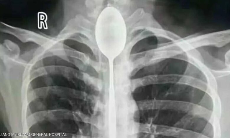 ومنذ أيام، تعرض الشاب لضربة في صدره، شعر بعدها بآلام وصعوبة في التنفس دفعته للذهاب إلى مستشفى في مقاطعة شينجيانغ الصينية، حيث اكتشف الأطباء وجود الملعقة، التي تسببت بالتهاب في المريء.
