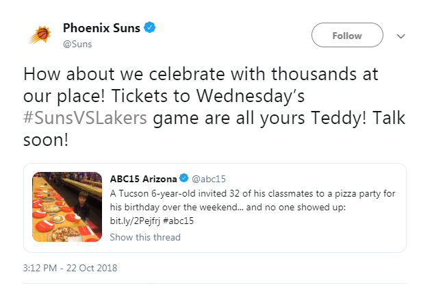 أول هذه العروض كانت من فريق "فينكس صنز" الذي ينافس بالدوري الأميركي لكرة السلة، والذي قدم دعوة للطفل "تيدي" من أجل حضور مباراة لهم في الدوري، احتفالًا بعيد ميلاده.