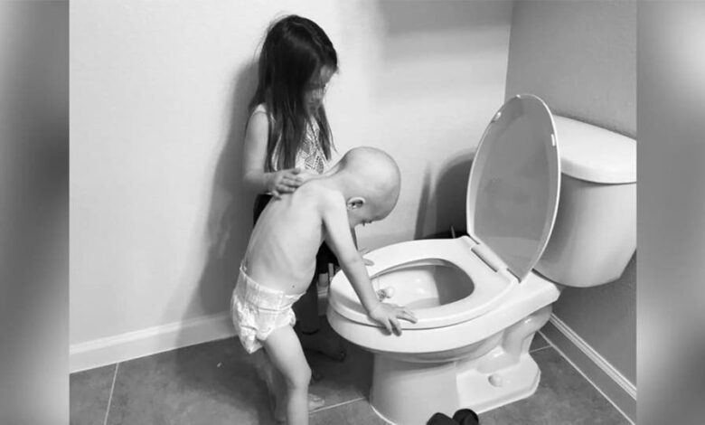 تسنده عند المرحاض.. صورة موجعة لطفل مريض بالسرطان وأخته