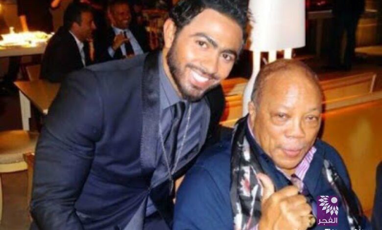 تلفزيون الفجر الجديد- نشر الفنان المصري تامر حسني صورة له تجمعه بالمنتج الشهير كوينسي جونز مكتشف مايكل جاكسون علي موقع تويتر وكتب أسفلها " With the legendary "producer Quincy Jones celebrating his birthday مع أسطورة الموسيقي كوينس جونز أثناء إحتفاله بعيد ميلاده .