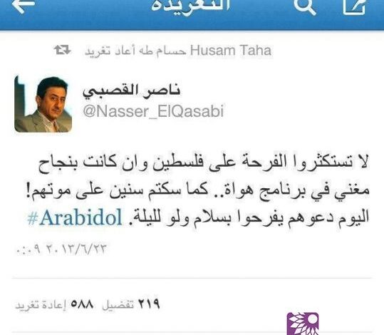 تلفزيون الفجر الجديد – كتب نجم المسلسل الكوميدي طاش ما طاش "ناصر القصبي" عبر صفحته على تويتر "لا تستكثروا الفرحة على فلسطين وإن كانت بنجاح مغني في برنامج هواة … كما سكتم سنين على موتهم ! … اليوم دعوهم يفرحوا بسلام ولو لليلة واحدة".