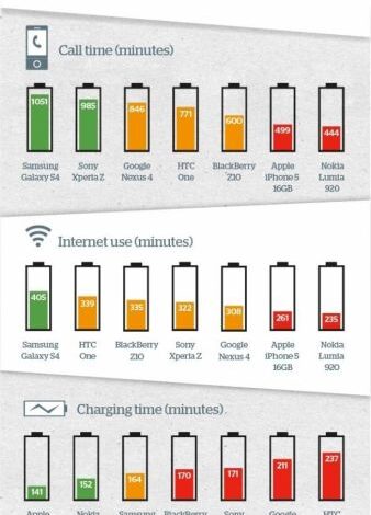 تلفزيون الفجر الجديد- إليكم الصورة التي نشرها موقع Which.co.uk على INFOGRAPHIC عن مقارنة بين بطاريات الهواتف الذكيّة الموجودة حالياً والأكثر مبيعاً في الأسواق.