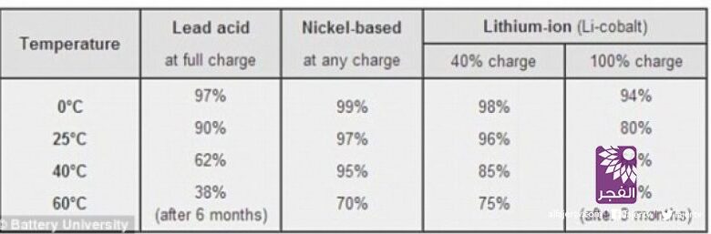 وأشار الى أنه بمتوسط درجة حرارة 25C، سوف تفقد بطارية الليثيوم أيون 20% من سعتها القصوى في كل عام، وفي حرارة تصل إلى 40C، يقفز الرقم إلى 35%.