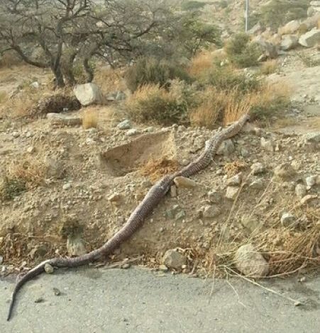 وذكر المواطن "الشهري" أن الثعبان يعد ضخماً، في جسده وطوله، أضاف أن الثعابين تعيش في تلك المنطقة بكثرة وتخرج بكثرة أثناء موسم الصيف للبحث عن الماء والطعام.