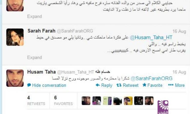 تلفزيون الفجر الجديد| بدون سابق انذار وبشكل مفاجئ وبعد قطيعة استمرت لفترة بينهما، حصلت مشادة كلامية بين نجمي ستار اكاديمي 8 سارة فرح وحسام طه امام معجبيهما على صفحات تويتر وذلك بعد اطلاق "طه" تغريدة مفاجئة اعلن فيها ان كلام والدة سارة فرح عنه غير صحيح – دون حديد ماذا قالت- وقال "طه": " حبايبي الكلام الذي صدر عن والدة الفنانة سارة فرح مافيه شي وهذا رأيها الشخصي ياريت ماحدا يرد بطريقه غير لائقة انا ما زعلت ولا تضايقت".