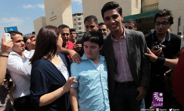 تلفزيون الفجر الجديد|بعد انتهاء زيارته لجامعه النجاح وعندما كان يحاول الفنان محمد عساف الخروج من الباب الجانبي لمسرح الامير تركي بالحرم الجديد محاولا تفادي الجماهير التي احتشدت على باب المسرح الرئيسي لالتقاط الصور كان الطفل طارق النابلسس (من ذوي الاحتياجات الخاصة ) ينتظر قرب سيارة عساف لالتقاط صورة معه بعد ان علم مسبقا بحضوره للجامعه وهي الزيارة التي حرصت الجامعه ان تكون بدون اعلان مسبق لاسباب كثيرة اهمها ان الزيارة كانت بغرض بحث سبل التعاون الفني بين عساف وكلية الفنون بالجامعه وتخوف القائمين على الزيارة من فقدان السيطرة على جدول عمل الفنان في الجامعه في حال تهافت المعجبين عليه باعتبار ان حرم الجامعه يضم الاف الطلبة .الا ان كل الاجراءات الامنية لم تمنع الطفل طارق من محاولة الحصول على صورة مع عساف الذي دخل مسرعا الى سيارته برفقة امن الجامعه ومرافقيه حتى تدخل احد المرافقين وابلغ الفنان محمد عساف بان هناك طفل يرغب بالتقاط صورة معه فخرج من سيارته ليجد طارق امامه وهو غير قادر على اقتحام الجموع التي وجدت في عودة عساف فرصة اخيرة لالتقاط صورهم فما كان من عساف الا ان توجه نحو طارق واحتضنه وطيب خاطره وكانت هذه الصورة المعبرة.