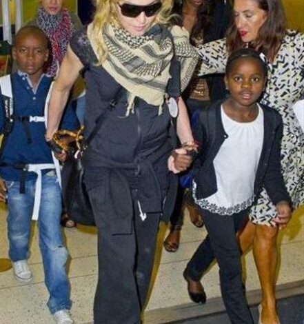 تلفزيون الفجر الجديد|في إطلالتها في مطار "هيثرو" في لندن، ظهرت النجمة مادونا البالغة من العمر 55 عاماً وهي تمسك يديّ ولديها بالتبني "دافيد" 7 سنوات و"مرسي" 7 سنوات، وتمشي إلى جانبها ابنتها البيولوجية لورد البالغة من العمر 17 عاماً.